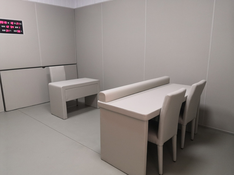 完善整墻,一般紀(jì)委談話室等公檢法辦公室都是3米高的墻,2.45米以下使用防撞墻板滿鋪,剩余高度我們是建議在防撞墻面上安裝木質(zhì)吸音板,不但可以吸音降低室內(nèi)回音,還可以達(dá)到墻面裝飾美觀的效果,質(zhì)量好實用性強(qiáng)而且經(jīng)濟(jì)實惠。